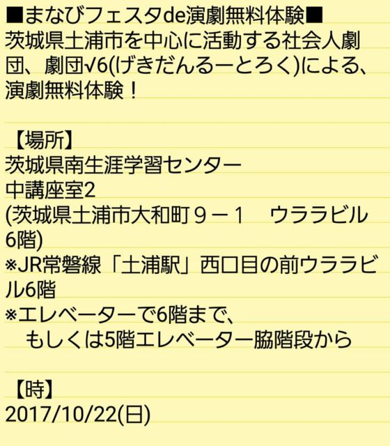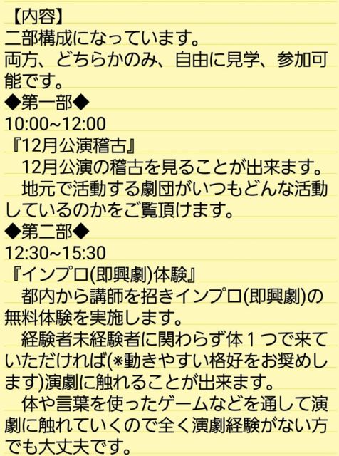 社会人劇団の劇団√6主催の『演劇無料体験』 ★第一部は社会人劇団の練習を赤裸々に公開します。 大人の部活動覗きに来てください! ★第二部は都内より講師を迎えインプロ(即興劇)を使った参加型演劇無料体験です。 台本を使った演技にも役立つヒントがあるかもしれません。 部活の練習方法にも使えるものがあるかもしれません。 お気軽にいらしてください!