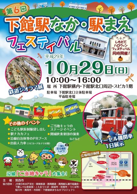 今年の「下館駅なか・駅まえフェスティバル」は10月29日(日)開催! 「下館レイル倶楽部」は、駅前ビル「スピカ」1Fオープンスペースで鉄道模型の運転展示を実施します! ・10月29日(日)第6回「下館駅なか・駅まえフェスティバル」出展!(下館レイル倶楽部 2017年10月1日) http://shimodate.blog.shinobi.jp/event_etc/shimodete_ekinaka_201710 ・第6回下館駅なか・駅まえフェスティバル(筑西市 2017年9月29日) http://www.city.chikusei.lg.jp/page/page003988.html 通常ですと、10月の第3土日(今年の場合は10月21日