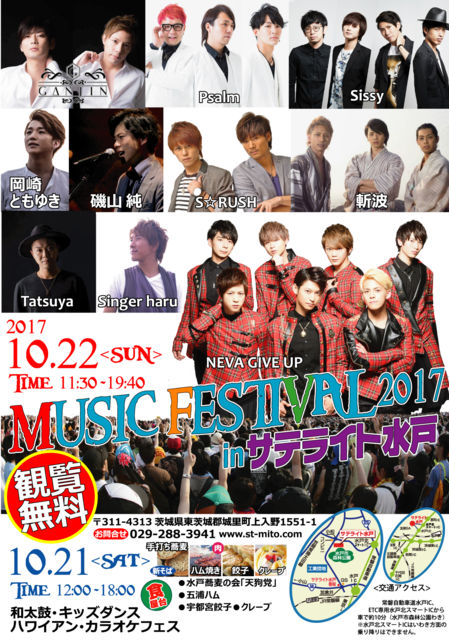 明日は、 茨城県水戸市のサテライト水戸で開催される【 サテライト水戸 ミュージックフェスタ 】に出演します!出演時間は、13:00〜予定です。 年に何回かバンドやソロで出演している「サテライト水戸」。 今回はいつもとは、ちょっと違うミュージックフェスです。 素敵なミュージシャンの皆さんがたくさん出演します。 ぜひ遊びに来てくださいね! お待ちしています! <近日 LIVE情報> ■10月22日(日) 茨城県水戸市 『 サテライト水戸 ミュージックフェスタ 』 13:00〜 ■10月28日(土) 横浜市都筑区