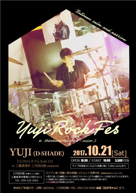 開催まで3週間切りました!東京からD-SHADEのスーパードラマーYUJIさんを三代目 白熊にお迎えして行われるユジロックフェス! アルバム30万枚を含めCDトータルセールス100万枚以上! 日本武道館、渋谷公会堂などをわかせた最強のドラムプレーを目の前でぜひ! そしてライブの後はYUJIさんと一緒に写真も撮れて食事ができるアフターパーティー(飲み放題、食べ放題)もあります! あと店内でよく聞かれる質問なんですが Q ライブはどこでするんですか? A 三代目 白熊(白熊ラーメン津店)の二階のプライベートルームで行います!