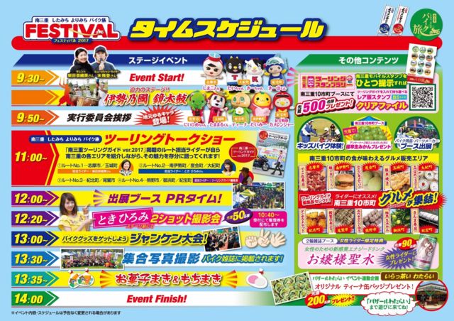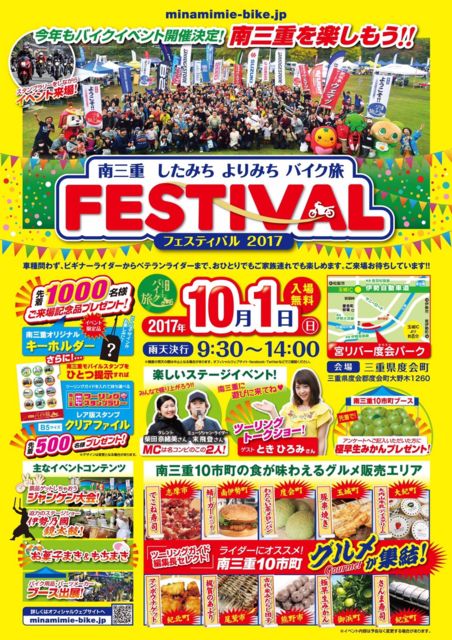 O.P.E.N.ライダースクラブツーリングのお知らせ。 『南三重したみちよりみちバイク旅フェスティバル』を見に行くだけのツーリングですw。 途中合流、途中離脱OK。 ご興味のある方はご一緒しましょう。 昨年は餅投げの餅をビニール袋いっぱいお土産にしました。今年もあるようですよ〜(^^) 集合時間場所 9:00 セブンイレブン津市河芸町上野店 目的地 三重県度会町・宮リバー度会パーク 〒516-2103 三重県度会郡度会町大野木1260 イベント案内 http://minamimie-bike.jp/