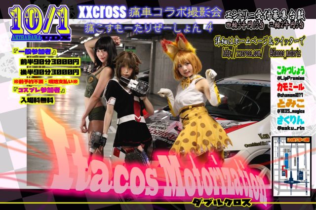 エントリー開始しました! 4輪5000円 2輪3000円 コスプレイヤー&RQと愛車が撮れるイベントです。 エントリー申し込みは ダブルクロスHPの問い合わせよりお願いいたします。 メッセージ本文欄にメーカー 車種、仕様(作品&キャラクター) などご明記ください。 http://xxcross.com/join-html 公式ツイッター https://twitter.com/itacos_motoriz 詳細決まったら、また追記しますー。