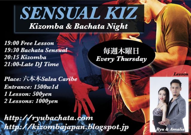 Kizomba & Bachata social held every thursday in Roppongi famous latin club SALSA CARIBE. Lesson by Ryu & Amalia.