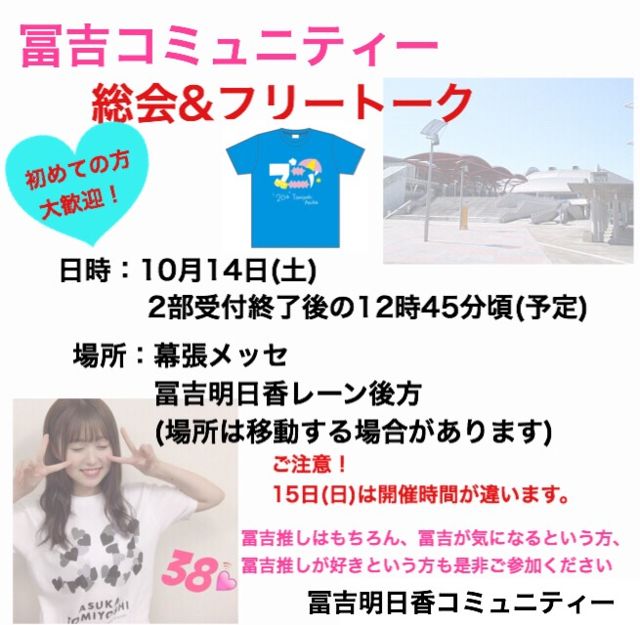 10/14¤ËËëÄ¥¥á¥Ã¥»¤Ç³«ºÅ¤µ¤ì¤ëAKB48°®¼ê²ñ¤Ë¤ÆÇòÀã´õÌÀ¤µ¤ó¤Î¥Õ¥¡¥óÁí²ñ¤ò¹Ô¤¤¤Þ¤¹ ÅöÆü¤Ï²èÁü¤ÎPOP¤ò»ý¤Ã¤Æ¤ªÂÔ¤Á¤·¤Æ¤ª¤ê¤Þ¤¹¡£ Áí²ñ¤È¤¤¤Ã¤Æ¤â·ø¶ì¤·¤¯¤Ê¤¤»¨Ã̤¬Ãæ¿´¤Î½¸¤Þ¤ê¤Ë¤Ê¤ê¤Þ¤¹¤Î¤Ç¡¢¤É¤Ê¤¿¤Ç¤â¤ªµ¤·Ú¤Ë¤´»²²Ã²¼¤µ¤¤¡£ ¢£»þ´Ö 10/14 1Éô¤ª¸«Á÷¤ê½ªÎ»¸å ¡ÊÅÓÃæÈ´¤±¡¢ÅÓÃæ»²²ÃOK¡Ë ¢£½¸¹ç¾ì½ê ¥ì¡¼¥ó¸åÊýÂÔµ¡¥¨¥ê¥¢ ¢£Áí²ñÆâÍÆ ¡¦¥Õ¥¡¥ó´é¹ç¤ï¤» ¡¦8´üÀ¸1¼þǯ¤ª½Ë¤¤¤Ë¤Ä¤¤¤Æ ¡¦·à¾ì¸ø±é²ó¿ô100Æü¤Î¤ª½Ë¤¤¤Ë¤Ä¤¤¤Æ ¡¦¥³¥ß¥å¥Ë¥Æ¥£±¿±Ä¤Ë¤Ä¤¤¤Æ ¡¦»¨ÃÌ ²¿¤«¼ÁÌä¤ä´õ˾Åù¤¬¤¢¤ê¤Þ¤·¤¿¤é¥³¥á¥ó¥È¤ò¤ª´ê¤¤Ãפ·