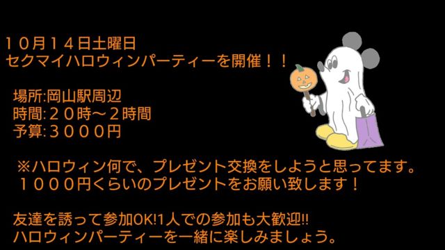 待ってました!!ハロウィンパーティー👻🎃 ちょっと早いけど、 一足先に倉敷の地で盛り上がっちゃいましょう!! ハロウィンなので、、、 「オレンジ色」か「紫色」をどこかに身につけてお越しください。 仮装やコスプレも大歓迎です^^* "ともつく"は、誰でも気軽に参加できる飲み会で、 とてもフレンドリーな空間です^^* 立食形式だからこそ、たくさんの人と会話が出来る!! そして、フリースタイルなので、自分のペースで会を楽しめる!! そんなところも魅力のひとつです☆ 「参加してよかった」「友達が増えました」「楽しかった」