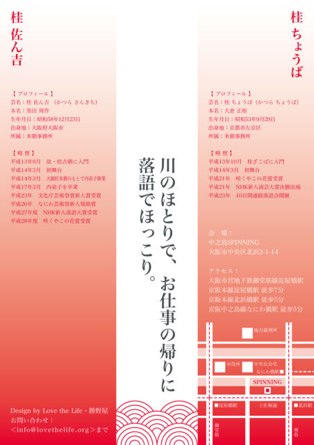 【 10月20日(金)第四回 中之島深夜寄席 】のご案内 お仕事帰りに、初秋の夜長はぜひ落語で! (第五回:2018年1月26日(金)に決定!) ■出演:桂佐ん吉・桂ちょうば ■日時:10月20日(金)第一部20時〜・第二部21時〜(各回50分) ■場所:中之島SPINNING(受付2F・会場3F)大阪市中央区北浜2-1-14 ■料金:第一部1500円・第二部700円・二部通し2000円 きもの割引200円 ■当日受付のみ自由席 https://www.facebook.com/events/178539539369317/ #中之島深夜寄席 #深夜寄席 #桂佐ん吉 #桂ちょうば #落語 #上方落語 #中之