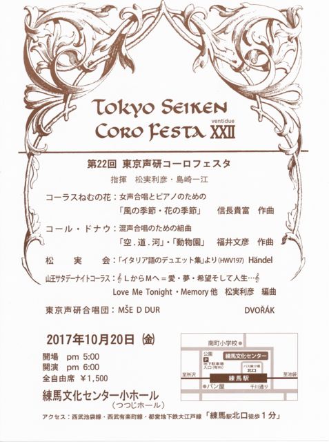 ♪練馬区の皆様へ、混声コーラスへいらっしゃいませんか♪ 場所は練馬文化センター、10月20日金曜日夜(ハナキンです。この単語が分かる方も知らない世代も、 音楽に少しでも興味有る方は、是非ご友人をお誘いの上お申し込み下さいませ。 詳細のご案内は以下のURLになります。ご連絡お待ち申し上げます♪ http://jmty.jp/tokyo/eve-con/article-743dn