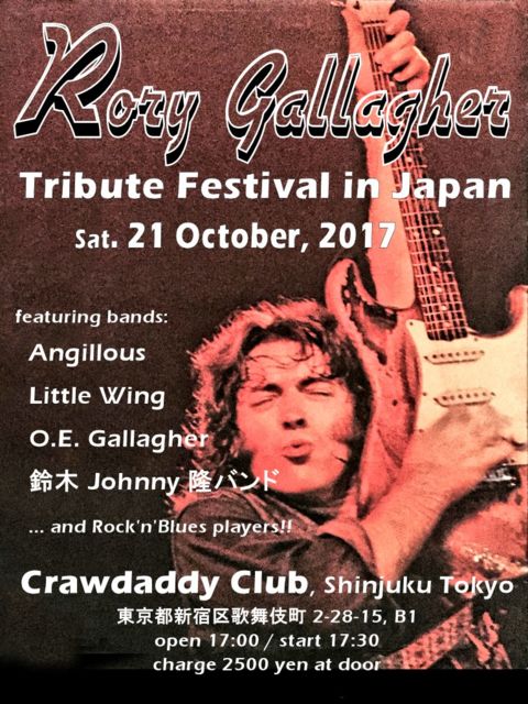 10/21 ËÜÆü¤Î¥é¥¤¥Ö¡¡ Rory Gallagher Tribute Festival 2017¡¡ OPEN 17:00 START 17:30 CHARGE 2500±ß¡¡ http://www.geocities.jp/rory_festival/¡¡ ½Ð±é¡¡ Angillous¡¡ ÎëÌÚJohnnyδ¥Ð¥ó¥É¡¡ Little Wing¡¡ O.E. Gallagher