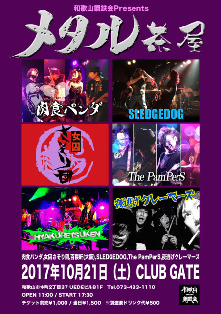 皆様お久しぶりです、和歌山鋼鉄会スタッフ きゃらです。 間もなく 和歌山鋼鉄会主催「メタル茶屋」を開催いたします。 不定期に開催しております ノンジャンルイベント「メタル茶屋」 今回は 各バンドさんに HR曲のカバーを一曲お願いしています。 普段HRから縁の遠いバンドさんもいらっしゃいますが だからこそ どんな音を聴かせてくれるのかお楽しみ! 和歌山鋼鉄会からは スタッフを中心に カバーバンド「女囚さそり団」を結成。 何を演るかは・・・( ̄ー+ ̄) 是非是非 観に来て下さいね!よろしくお願いします。 10月