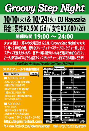 10·î¤âÂ裲¡õÂ裴²ÐÍËÆü¤Ï¡ª¡ÚGroovy STEP NIGHT¡Û19»þ¡Á21»þ°Ì¤Î´Ö¡¢´Êñ¤Ê¥Õ¥ê¡¼¥Á¥ã¥Á¥ã¥¹¥Æ¥Ã¥×¤Î¥ì¥¯¥Á¥ã¡¼¤¢¤ê¤Þ¤¹¡ª ½é¿´¼Ô¤ÎÊý¡¢¤ª°ì¿ÍÍͤǤ⡢ÅöŹ¥¹¥¿¥Ã¥Õ¤¬¤´Âбþ¤µ¤»¤ÆÄº¤¤Þ¤¹¤Î¤Ç¤É¤¦¤¾¤ªµ¤·Ú¤Ë¤´»²²Ã¤¯¤À¤µ¤¤¢ö ¡Úư²è¡Û http://youtu.be/TJumPL0WciA http://youtu.be/jfhrY1yxn-A http://youtu.be/xJEb3mrihDc ¡ÚDJ¡ÛHayasaka ¡Ú²»³Ú¡ÛALL MIX ¡Ê21»þ°Ì¤«¤é¤ÏÄ̾ï¤ÎDISCO TIME¤Ë¤Ê¤ê¤Þ¤¹¡£¥ê¥¯¥¨¥¹¥È¤Ë¤â½ÐÍè¤ë¸Â¤ê¤ª±þ¤¨¤¤¤¿¤·¤Þ¤¹¤Î¤ÇDJ¤Þ¤Ç¤ªµ¤·Ú¤Ë¤É¤¦¤¾¢ö¡Ë ¡Ú³«ºÅ»þ´Ö¡Û 19:00¡Á24:00 ¡ÚÎÁ¶â¡Û ÃËÀ¡§¡ï2