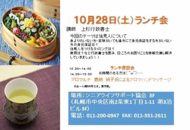今回のテーマは後見人について 身よりのいない方、 家族が遠方にいて、身元保証をする方がいない方の身元保証は? 後見人をつけるタイミングは? 費用は? など、行政書士を囲み、日ごろのお困りごとを情報交換し、解決していきましょう。 12時30分〜 ランチ座談会 14時00分〜 ご希望の方、ワンコインで、アロマハンドマッサージ 要予約 お弁当やお飲物をお出しいたします。 申し込みは一般社団法人シニアライフサポート協会 TEL:011-200-0947