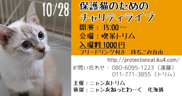 ☆LIVE出演者 大募集です(^^♪ 10月28日(土) ・10:00〜13:00猫譲渡会 ・15:00〜チャリティーライブ ※ライブ入場料 ¥1000…持ち込み自由・フリードリンク (入場料は出演者の方にもご協力いただきます) ☆暫定タイムテーブル☆ 15:00〜15:30 ニャン友BANDさん 15:30〜16:00 −Coffee Break−さん 16:00〜16:30 TAKUMIさん 16:30〜17:00 じゃぽさん 17:00〜17:30 岸孝志さん 17:30〜18:00 酒井博史さん