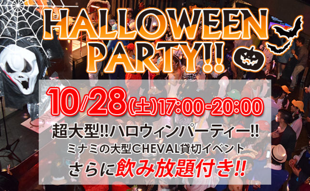 現在、参加受付中♪ ※10月28日(土)10時に参加申し込み終了予定 現在の参加人数 合計205名 男性95名 女性110名 下記の日程はまだ空きがございます のでご確認下さい http://mixi.jp/view_bbs.pl?id=68457059 イベント詳細 大阪中のハロウィンを楽しむ人が一堂に会します 今年もチョー盛り上がりますよーっ!!!!♪───O(≧∇≦)O────♪ 今回は心斎橋「CHEVAL-シュバル-」にて開催 ミナミのパーティスペースCHEVAL-シュバル