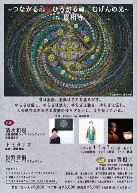 皆様、いつもありがとうございます。 この素敵な場をお借りしてシェアさせて頂きます。 以下、出演ライブの詳細になります。 つながる心♡ひろがる魂 むげんの光 in 實相寺 音は振動、振動は全てを揺るがす。 ゆらぎは癒し、ゆらぎは活力、ゆらぎは動き、ゆらぎは流れ。 人も動物も木も花も波動のゆらぎを出し、また受けている。 「音楽 Music」 by 清水和恵 日時:2017年11月3日(金・祝)13:00開場 13:30開演 16:30終演 場所:日蓮宗 實相寺 住所:東京都大田区池上2-10-17 出演: 清水和恵(点描画即興