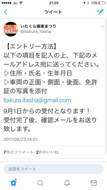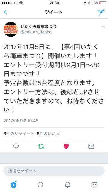 地元で3年前から、近県の痛車の方々が参加していただきましたが、今回はこの場を借りていろいろな方々が来て頂けたらありがたいです。当日は福島の萌祭と被ってしまうので来れない人が多いと思いますが参加していただけたら嬉しいです。 ある程であれば質問に答えられます!!