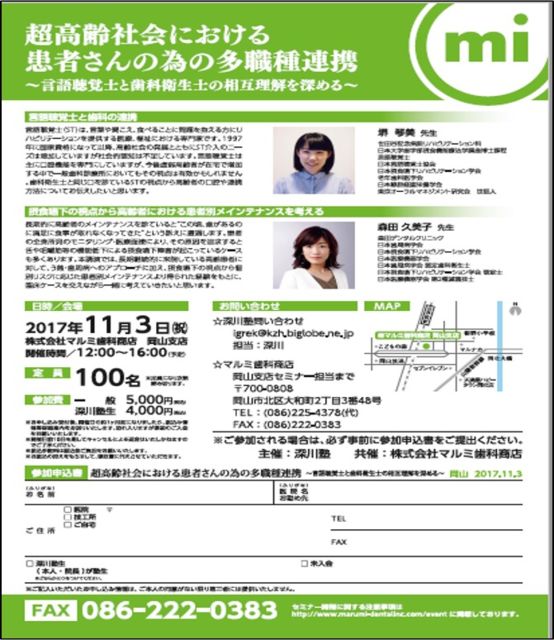 第20回深川塾開催のお知らせです. 今回は,(株)マルミ歯科商店共催で,深川塾が岡山県に進出する運びとなりました. 内容は,深川塾生とST(言語聴覚士)コラボの多職種連携と,とても興味深いものです. テーマ 【超高齢社会における患者さんの為の多職種連携〜言語聴覚士と歯科衛生士の相互理解を深める〜】 講師,および講演テーマ 堺 琴美先生氏(ST):世田谷記念病院リハビリテーション科勤務 【言語聴覚士と歯科の連携】 森田 久美子氏(DH):森田デンタルクリニック勤務 【摂食嚥下の視点から
