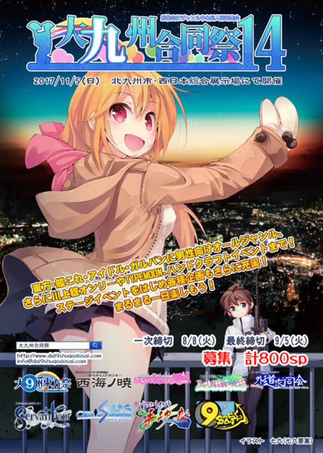 このコニュニティのイベントトピックはイベントのエントリー応募ではなく、「参加表明・交流」のためのトピックです。募集期限が設定されていますが、エントリー募集とは関係ありませんのでご注意下さい。 http://dai9shu.godosai.com/dai9shugodosai14.html 開催日 2017年11月5日(日) 開催地 福岡県北九州市 西日本総合展示場・新館 募集スペース 計800SP スタッフ募集のお知らせ 合同祭/東方祭および関連イベントではイベントスタッフを募集しています。詳しくはスタッフ募集ページをご覧下さい。 一般参加方法 カタログ