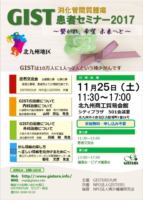 北九州・小倉でのGIST患者セミナー開催のお知らせです。 開催日が迫ってからの告知となってしまい、申し訳ありませんが、多くの患者さん、ご家族の参加をお待ちしております。 お申し込みは不要です。 日程・場所 平成29年11月25日(土)11:30〜17:00 北九州商工貿易会館 シティプラザ501会議室 (北九州市小倉北区古船場町1番35号) 講師 高橋 剛 先生(大阪大学医学部附属病院 消化器外科) 山村真弘 先生(川崎医科大学附属病院 臨床腫瘍科) ビデオ講演 若尾文彦 先生(国立がん研究センターがん対策情報センター)