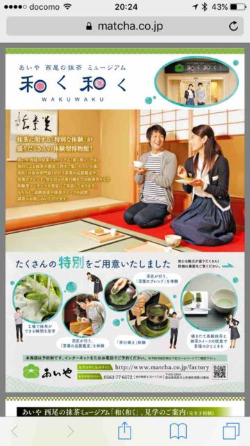 追記2: お2人キャンセルが出ましたので、あと2名追加募集しますね。 よろしくお願いします♪ 追記:先ほど抹茶ミュージアムから連絡があり、2週間前までに人数を連絡下さいとのことでした。 そこで、募集期限を11月3日までいたします。 予約が全く取れない「あいや 西尾の抹茶ミュージアム 和く和く」の第二弾です!! 説明・・・ホームページより。 “あいや西尾の抹茶ミュージアム 和く和く”は、 わくわくするような抹茶体験や製造工程の見学を通して、 抹茶の新しい魅力に触れられる体験型博物館です。 8月25日に3名のみのイベ