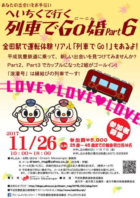 「へいちくで行く『列車でGo婚』Part6」のご案内 平成筑豊鉄道に乗って、新しい出会いを見つけてみませんか。 レトロチックな「浪漫号」から秋の車窓を眺めながら。 沿線の味覚を楽しんだり、地域を散策したり、 本物の列車運転が体験できる「リアル列車でGo!」も待っています。 貴重な体験になること間違いなし! Part2、Part3の成立カップルからは、 各1組ゴールインが誕生しています! ・開催日時:2017年11月26日(日)10:00〜18:00頃 ・参加資格:25歳〜45歳の独身男