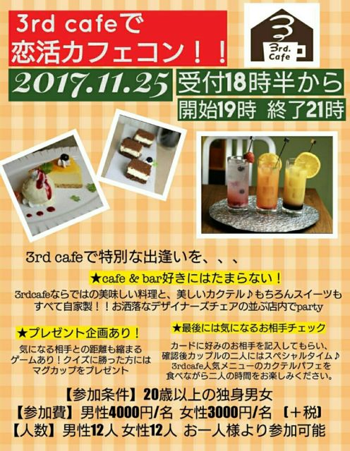 来月3rd.Cafeで開催されるカフェコンpartyのお知らせです📢 クリスマスまでに素敵な相手を見つけたい皆さん😊ぜひぜひご参加くださいね〜♪ 3rd.Cafe で特別な出逢いを… ♡CAFE&BAR好きにはたまらない! 3rd.Cafeならではの美味しいお料理と、美しいカクテル♪もちろんスイーツも全て自家製!!お洒落なデザイナーズチェアの並ぶ店内でparty ♡プレゼント企画あり! 気になるお相手との距離も縮まるゲームあり♪クイズに勝った方には可愛いマグカップをプレゼント ♡最後には気になるお相手チェック! カードに好み