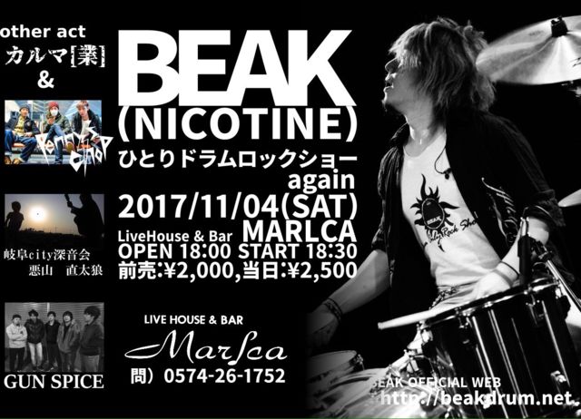 2017年11月4日(土) 美濃加茂Marlca ◆ひとりドラムロックショー again◆ 【出演】 BEAK GUN SPICE penny's chop & カルマ業 岐阜city深音会 悪山直太狼 OPEN18:00/START18:30 ADV:2000yen/DOOR:2500yen (入場時ドリンク代別途必要です) 岐阜city深音会 悪山直太狼は4組中2番目19:15〜の出演予定です 美濃加茂Marlca:岐阜県美濃加茂市太田町2546-6 PIXIE ROUGEの出演はありません http://s.maho.jp/homepage/eb95c4a67d645ad2/