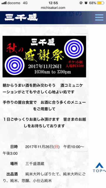 多治見市笠原町の酒蔵、三千盛で秋の新酒を楽しみませんか? 2017秋 酒蔵感謝祭 AM10:00〜PM3:00 http://www.michisakari.com/product/archives/286 開催地:三千盛酒蔵 岐阜県多治見市笠原町(旧笠原町)2919 入場料500円【チケット11枚、三千盛オリジナル酒猪口付】で色んな三千盛を味わう事が出来まして、食べ物屋さんも出店で色んな物を味わう事が出来ます。(呑まない方は誓約書に一筆すれば無料入場可) 小仕込純米、まる尾はチケット2枚で酒猪口1杯、それ以外はチケット1枚にて酒猪口1杯試飲出来ます。 追加チケットは、11枚5