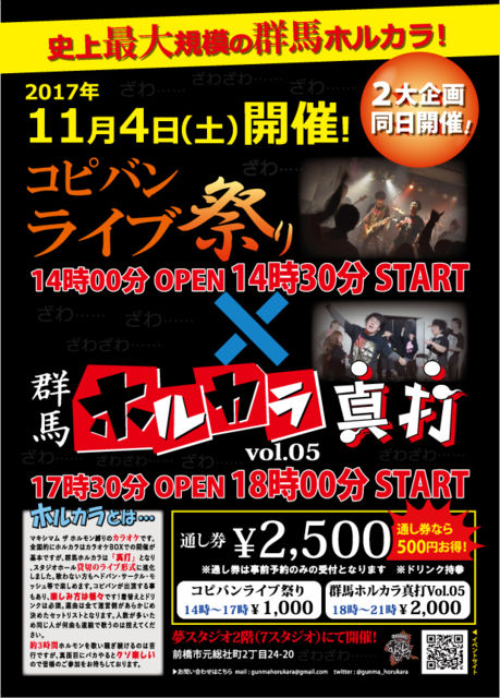 初めましての方は初めまして! お久しぶりの方はお久しぶりです! いつも会ってる方はいつもお世話になっております! 2017年11月4日、群馬ホルカラ 真打 Vol.05 開催します! 今回も最大収容人数170人くらいの大きなホールでホルモン縛りカラオケやっちゃいます! さらに!!! 今回は2部構成!!! 昼の部はコビバンライブ祭り、夜の部はホルカラを開催予定!!! 史上最大規模の群馬ホルカラをお楽しみに!!! ぜひ皆様のご参加をお待ちしております! 詳細の確認や参加申込は以下のイベントページからとなりますので閲覧