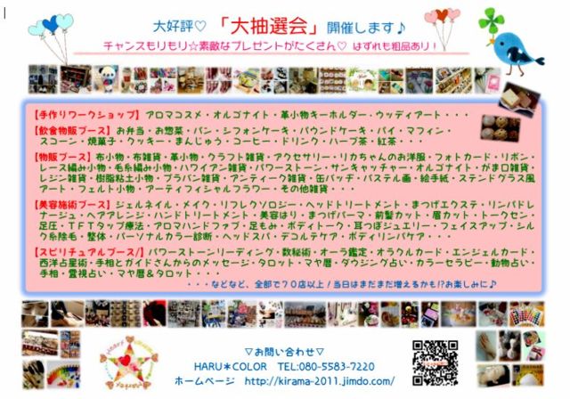 ¤³¤ó¤Ë¤Á¤Ï ´ÉÍý¿ÍÍÍ¡¢¥¹¥Ú¡¼¥¹¤ª¼Ú¤êÃפ·¤Þ¤¹¡£ ¥³¥ß¥å¤Î¤ß¤Ê¤µ¤Þ¡¢¤´Í÷¤¤¤¿¤À¤¤¢¤ê¤¬¤È¤¦¤´¤¶¤¤¤Þ¤¹¡£ Ë̹Åç»Ô¤Î¤ªÎÙ¡¢ÆîËÚÄ®¤Ç¥«¥é¡¼¥µ¥í¥ó¡ÖHARU¡öCOLOR¡×¤ò£Ï£Ð£Å£Î¤·¤Æ¤¤¤ë¡¢¤«¤Ä¤ä¤Þ¤Ç¤¹¡£ ÆîËÚÄ®¤Ç¤ªÊ줵¤óã¤Î¤¿¤á¤Î³Ú¤·¤¤¥¤¥Ù¥ó¥È¤ò³«ºÅ¤·¤¿¤¤¤È¡¢¤Ï¤¡¤È¥¥é¥¥é¥Þ¡¼¥±¥Ã¥È¤ò2011ǯ¤ËΩ¤Á¾å¤²¡¢º£Ç¯¤Ç´Ý6ǯ¡£Ë̹Åç»Ô¤«¤é¤â½ÐʼÔÍͤò¤Ï¤¸¤á¡¢ËèǯÌó500̾¤Î¤¿¤¯¤µ¤ó¤ÎÊý¤Î¤´Íè¾ì¤¤¤¿¤À¤¤¤Æ¤ª¤ê¤Þ¤¹¡£¤¢¤ê¤¬¤È¤¦¤´¤¶¤¤¤Þ¤¹ ¡Ö¤Ï¤¡¤È¡¡¥¥é¥¥é¥Þ¡¼¥±¥Ã¥È¡¡in¡¡¤Ê¤ó¤Ý¤í¡¡vol.10¡× º£Ç¯ÅÙ¤ÏÌ󣸣°¥Ö¡¼¥¹¤Î¤ªÅ¹¤¬Æî