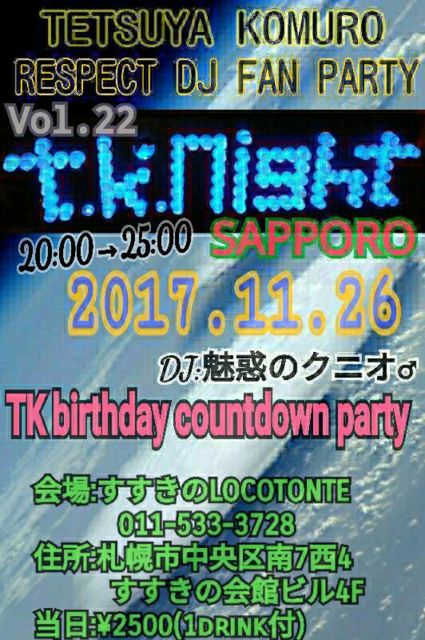 ¡È»¥ËÚt.k.night vol.22¡É ¡Á½Ë¡¦¾®¼¼Å¯ºÈ59ºÐ¥Ð¡¼¥¹¥Ç¡¼¥«¥¦¥ó¥È¥À¥¦¥ó¡Á Æü»þ¡§2017ǯ11·î26Æü(Æü)20:00¡Á25:00¡ª ²ñ¾ì¡§¤¹¤¹¤¤ÎLOCOTONTE¡¡011-533-3728 ½»½ê¡§»¥ËÚ»ÔÃæ±û¶èÆî7¾òÀ¾4ÃúÌܤ¹¤¹¤¤Î²ñ´Û¥Ó¥ë4F http://diggnight.com/clubs/info/313 ÅöÆü¡§¡ï2500(1drinkÉÕ¡ÈRAINBOW RAINBOW¥«¥¯¥Æ¥ë¡É´Þ¤à) DJ¡§Ì¥ÏǤΥ¯¥Ë¥ª¡é¡¿etc Special Show Time¡§Ã˳ùÅÄ¿¿¸ã¡¿etc ¢¨¾åµ¤Î¤ªÌ䤤¹ç¤ï¤»¡¢¼ÁÌä¡¢»²²Ã´õ˾¡¢Ê¤Ӥˡ¢ ·¯¤«¤éÆÏ¤¯¥¨¥¢¥á¡¼¥ë¤Ï¤³¤Á¤éËø¡£ kuniosoundcafe¡÷yahoo.co.jp ¢¬¡÷¤òȾ³Ñ¤ËÊÑ´¹¤·¤Æ²¼¤µ¤¤¡£ ¥¯