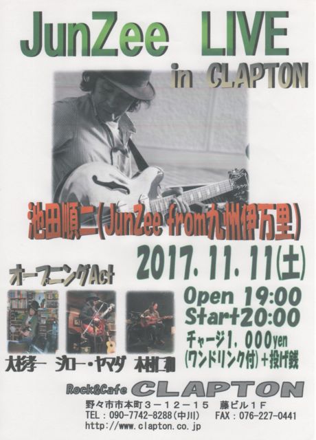 £±£±·î£±£±Æü¡ÊÌÚ¡Ë £±£¹¡§£°£°¥ª¡¼¥×¥ó£²£°¡§£°£°¥¹¥¿¡¼¥È ¡Ø¡¡JunZee LIVE in CLAPTON ¡Ù ÃÓÅĽçÆó¡ª¡ª ¶å½£°ËËüΤ¤«¤é ¤Þ¤¿¤Þ¤¿¤ä¤Ã¤Æ¤¤Þ¤¹ Ⱦǯ¤Ö¤ê£²ÅÙÌܤΣạ̃ÁPTON¥é¥¤¥Ö ¡ÔJunZee¡¡¥×¥í¥Õ¥£¡¼¥ë¡Õ ¶å½£ º´²ì¸©°ËËüΤºß½» ¸Å¤¤¥Ö¥ë¡¼¥¹¤ò¥á¥¤¥ó¤Ë ¥ª¥ê¥¸¥Ê¥ë¤È¥í¥Ã¥¯¤Ê¥Õ¥£¡¼¥ê¥ó¥°¤Î²Î¤ò ÃÆ¤¸ì¤ê¤Ç²Îι¤·¤Æ¤Þ¤¹ ¥ª¡¼¥×¥Ë¥ó¥°Act Âç¿ù¹§°ì¡¡¡¡ ¥¸¥í¡¼¡¦¥ä¥Þ¥À¡¡¡¡ ÌÚ¼¿ÎÏ ¥ß¥å¡¼¥¸¥Ã¥¯¥Á¥ã¡¼¥¸ £±¡¤£°£°£°±ß¡Ê¥ï¥ó¥É¥ê¥ó¥¯ÉÕ¡Ë¡ÜÅꤲÁ¬