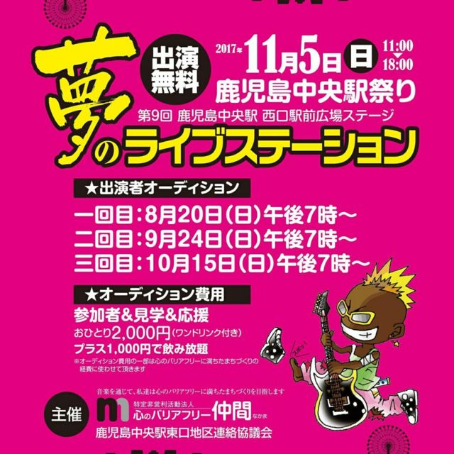 11月5日にアミュプラザ付近すべてを使ったイベントがあります🎵 西口では夢のライブステーションということで弾き語りからバンドまで音楽ステージを設けます\(^-^)/ 参加者はイベントの趣旨を理解してもらうためオーディション形式です🎵 こんげつのオーディションは24日🎵 皆様のお越しをお待ちしてます\(^-^)/