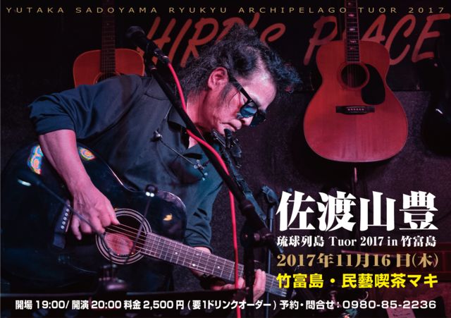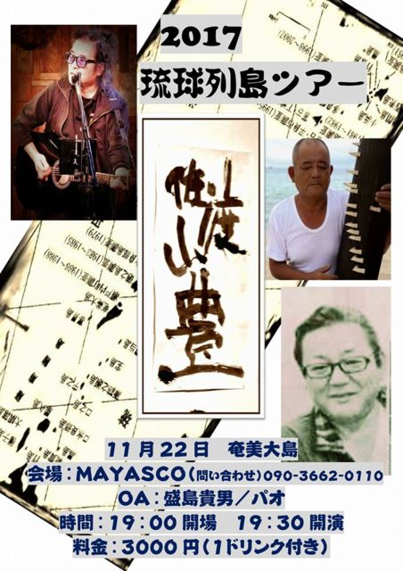 11月16日(木) 竹富島 民藝喫茶マキ http://www.mingeimaki.com/ 開場19:00/開園20:00 料金2500円(要ドリンクオーダー) 11月17日(金) 石垣島 BarBb https://m.facebook.com/bar.ishigakiBb/?locale2=ja_JP 開場20:00/開園20:30 料金2500円(要ドリンクオーダー) 11月19日(日) 宮古島 雅歌小屋(ガカゴヤ) https://m.facebook.com/gakagoya 開場20:00/開園20:30 料金3500円(1ドリンク付) 11月22日(水) 奄美大島 MAYASCO https://m.facebook.com/mayasco.amami/?locale2=ja_JP OA:パオ・盛島貴男(奄美竪琴 )https://m.youtube.com/