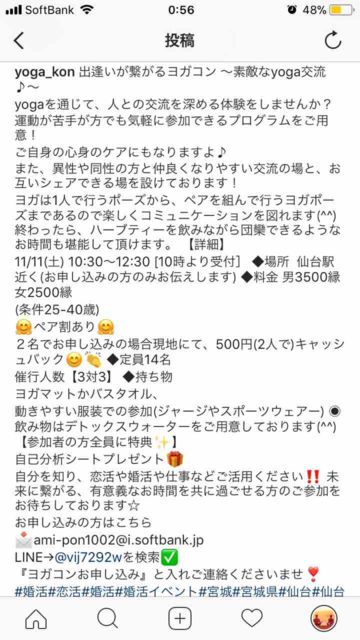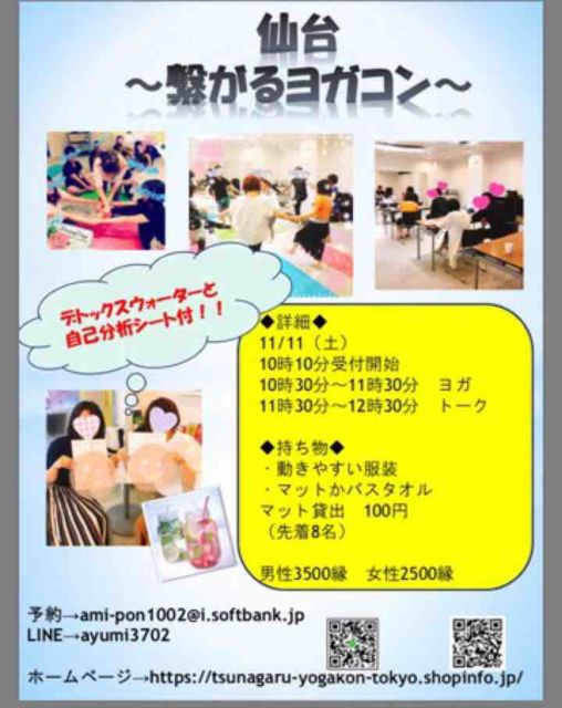 繋がるヨガコンin仙台 都内で大人気のイベント 繋がるヨガコンが仙台に上陸❣️ ヨガを通じて男女の交流を体験しませんか? 🚹3500縁 🚺2500縁 ペア割あり→500キャッシュバック✨✨ 定員14名 詳細知りたい方やご予約の方は こちらまでご連絡ください💁 ami-pon1002@i.softbank.jp