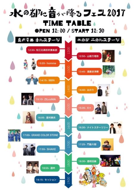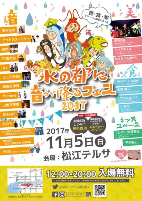 11/5(sun) 松江テルサホール 「水の都に音が降るフェス」 <CAST> homme 遊吟 門脇大樹 SHAKE みのり GRAND COLOR STONE -1 山根万理奈 ナイトスターリリー ZILCONIA 遠藤波津輝 X+ 9BIN and more! 時間:12:00〜20:00 観覧無料 バンドスタイルです! [support] Gt :吾郷冬樹 / Dr : 松尾KEG 飲食ブース、キッズスペース、その他催しあり! イベントブログ http://ameblo.jp/mizunomiyakofez/