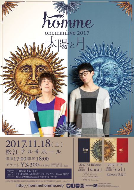 初のホールワンマンです!! 記念すべき日にぜひ homme ONEMAN LIVE 2017 -太陽と月- 日時:2017年11月18日(土) 会場:松江テルサホール(島根県松江市朝日町478-18) 開場/開演:17:00/18:00 チケット:\3300(全席指定) ※未就学児入場不可 ※チケットはお一人様一枚必要 [これからを頼むぞ割] 2017年時点で現役在学生の方は当日学生証提示で500円キャッシュバック <チケットぴあ最速先行発売> 受付期間:3月4日(土)12:00〜3月20日(月・祝)23:59 http://w.pia.jp/t/homme-s/ <チケット一般発売> 発売日:7月