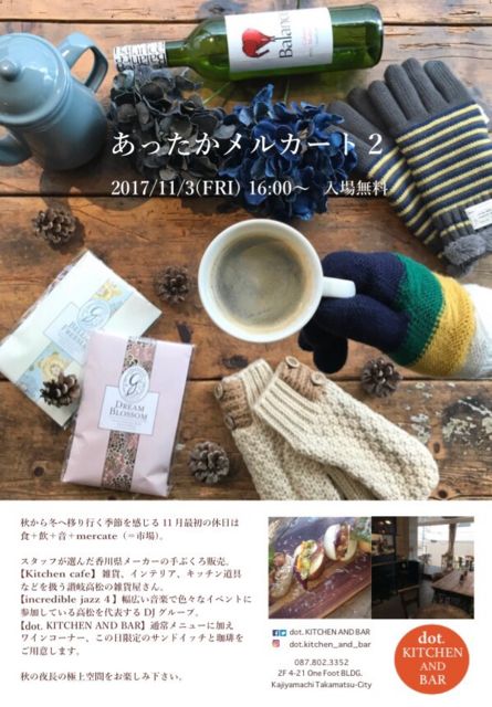 komachiにも掲載される予定ですが、 高松のdot. KITCHEN AND BARのイベントと同時開催の飲み会です( ¨̮ ) 費用:1人3500円 内容:飲み放題付きのコース料理 時間:19半〜21時半 飲み放題とコース料理は2時間制ですが、dot. KITCHENのイベントは16時〜24時まで開催しておりますので、19時半より前に来てもらっても問題ありません! もちろん飲み会終了後にそのまま残ってもらっても大丈夫ですꙭ҉ ※19時半〜21時半以外の時間は単品注文になりますm(_ _)m dot. KITCHENのイベントでは冬物手袋の販売、音楽などいろいろやる