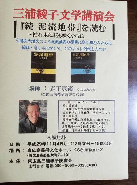【三浦綾子広島読書会から文学講演会のお知らせ】 三浦綾子広島読書会から文学講演会のお知らせがありますので、ご紹介します! 三浦綾子文学講演会 主題:続泥流地帯 日時:11月4日(土) 13時30分〜15時30分 会場:東広島芸術劇場文化ホール「くらら」研修室1・2 〒739-0015 広島県東広島市西条栄町7番19号 http://kurara-hall.jp/access/ 会費:無料 三浦綾子読書会の森下辰衛代表を講師に迎えての文学講演会です。 『泥流被害』という苦難に対して、主人公たちがどのように立向っていったのか、 とても参考になる、