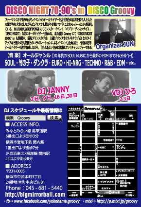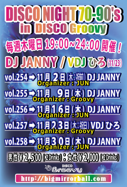 ★11月も毎週木曜日は!おなじみGroovyのディスコナイト★ 70年代のSOULミュージックから最新のEDMまでオールヒットメドレー!踊れる曲盛り沢山でお贈りします♬ 【Organized By DISCO Groovy】 【DJ】 JANNY(MAHARAJA ROPPONGI) 【音楽】ALL GENRE (SOUL、竹の子、ダンクラ、EURO、HI-NRG、TECHNO、R&B、EDM、etc…) 【開催時間】 19:00〜24:00 【料金】 男性:¥2,500 / 2Drinks 女性:¥2,000 / 2Drinks ※バースディの御祝い等でケーキ・お花がご必要な場合は事前に当店スタッフまでお電話、メール等にてご