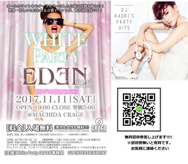 ⇒https://www.facebook.com/events/1418524134863739/ 11月11日(土)町田 CRAGE WHITE PARTY-EDEN-楽園 2nd 先着にて無料招待券 差し上げます! 詳細随時更新 追加します!! ⇒https://ameblo.jp/trancefamily/entry-12314632862.html ⇒https://souljapan.jp/club_event/10943.html 話題のCRAGE で ホワイトパーティー2000人規模で開催決定! SPゲストに 世界1の女性DJ KAORI 出演決定! 無料チケット持参で 入場無料!!! 限定数がある為 お早めに!!!! 無料招待券 は郵送します。