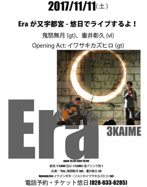 ★2017/11/11(sat) ERA:壷井彰久vl,鬼怒無月g Opening Act:岩崎和広(g) at 宇都宮 悠日 http://www2.yujitsu.com/ OPEN 15:30 START 16:00 前売¥3,000,当日¥3,500(+order) ★よろしくお願いします!