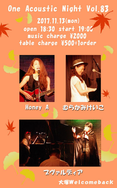 ¡ÁOne Acoustic Night vol.83¡Á 11·î13Æü¡Ê·î¡Ë³«¾ì18:30 ³«±é19:00 ¡ÚWelcomeback¡Û http://www.welcomeback.jp/ ¢©170-0005 ÅìµþÅÔËÅç¶èÆîÂçÄÍ£³¡Ý£´£´¡Ý£±£± ¥Õ¥µ¥«¥Ó¥ë£Â£± Tel & Fax 03-5957-5141 19:00¡Á19:45¡¡Honey A 20:00¡Á20:45¡¡¤à¤é¤«¤ß¤±¤¤¤³ 21:00¡Á21:45¡¡¥Ö¥ô¥¡¥ë¥Ç¥£¥¢ 22:30 close music charge \¡ï2,000 ¡Ê¥Æ¡¼¥Ö¥ë¥Á¥ã¡¼¥¸\¡ï500¡¦°û¿©ÂåÊÌ¡Ë