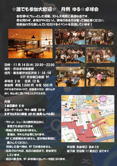 管理者様スペースをお借ります。 会社帰りにちょっとした運動、ストレス発散に最適な会です。 男女問わず、卓球がやりたい人、興味がある方は奮って御応募ください。 ご無沙汰振りに開催。 初参加の方も楽しんでいただけるイベントを目指しています。♪ 日時:11月14日(火) 20:30〜22:00 場所:渋谷卓球倶楽部 住所:東京都渋谷区渋谷1-14-14 EST渋谷東口会館 9F 渋谷駅 宮益坂口徒歩1分 地下鉄 渋谷駅11番出口 出てすぐ 卓球台 2台 定員 12名 参加費 男性 1,000円 女性 500円 ガチな会ではありません。 経験者
