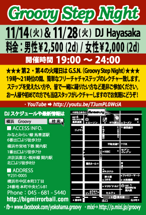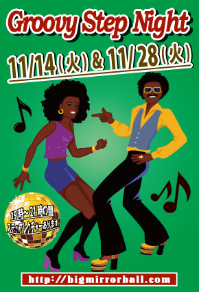11月も第2&第4火曜日は!【Groovy STEP NIGHT】19時〜21時位の間、簡単なフリーチャチャステップのレクチャーあります! 初心者の方、お一人様でも、当店スタッフがご対応させて頂きますのでどうぞお気軽にご参加ください♪ 【動画】 http://youtu.be/TJumPL0WciA http://youtu.be/jfhrY1yxn-A http://youtu.be/xJEb3mrihDc 【DJ】Hayasaka 【音楽】ALL MIX (21時位からは通常のDISCO TIMEになります。リクエストにも出来る限りお応えいたしますのでDJまでお気軽にどうぞ♪) 【開催時間】 19:00〜24:00 【料金】 男性:¥2