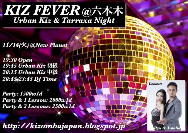 ★KIZ FEVER★ ヨーロッパで大人気のKizombaアーバンスタイルUrban Kizダンサーの為のイベントです! 海外フェスティバルの"Urban Kiz/Tarraxa Room"をイメージし、思いっきりアーバンスタイルを楽しめる選曲です。 レッスンは初級と中級の2レッスン。ビギナーの方も経験者も大歓迎です。 ◆日時(Date): 11月14日(火)19:30-23:45 ◆場所(Place): 六本木『NEW PLANET』 東京都港区六本木3-10-5 マリナービル1F Tel. 03-3470-4340 http://newplanet.jp/ ◆ 料金(Fee): Party: 1500w1d Party & 1 Lesson: 2000w1d Pa