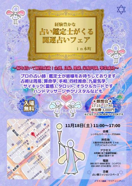 毎月大阪本町で開催してる開運占いフェア。 11月は18日の土曜日に開催です。 占い、霊感、ヒーリング、マッサージ、アロマ、雑貨、手作り販売など幅広く出展しています✨ 一緒に楽しみませんか〜💝 前回はハロウィンでしたので、仮装ありで楽しみました