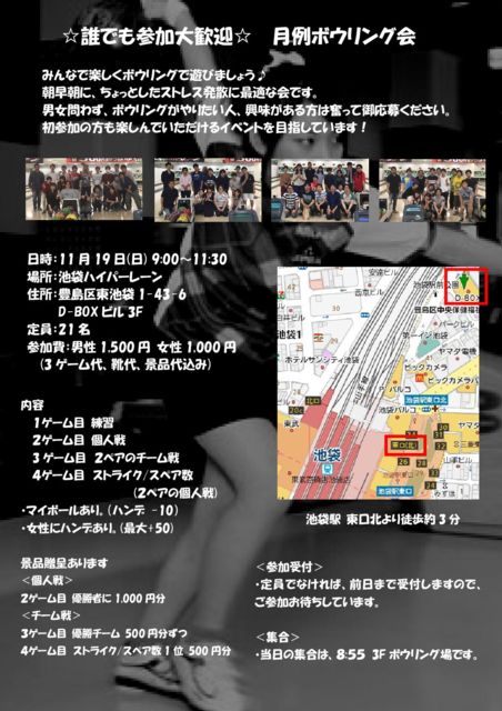 ¤ß¤ó¤Ê¤Ç³Ú¤·¤¯¥Ü¥¦¥ê¥ó¥°¤ÇÍ·¤Ó¤Þ¤·¤ç¤¦ (^O^)¡¿ Ä«¡¢ÁáÄ«¤Ë¤Á¤ç¤Ã¤È¤·¤¿¥¹¥È¥ì¥¹È¯»¶¤ËºÇŬ¤Ê²ñ¤Ç¤¹¡£ Ã˽÷Ìä¤ï¤º¡¢¥Ü¥¦¥ê¥ó¥°¤¬¤ä¤ê¤¿¤¤¿Í¡¢¶½Ì£¤¬¤¢¤ëÊý¤Ïʳ¤Ã¤Æ¸æ±þÊ礯¤À¤µ¤¤¡£ ½é»²²Ã¤ÎÊý¤â³Ú¤·¤ó¤Ç¤¤¤¿¤À¤±¤ë¥¤¥Ù¥ó¥È¤òÌܻؤ·¤Æ¤¤¤Þ¤¹¡£¢ö Æü»þ 11·î19Æü(Æü) 9:00¡Á11:30 ¾ì½ê ¥Ï¥¤¥Ñ¡¼¥ì¡¼¥ó ½»½ê ËÅç¶èÅìÃÓÂÞ1-43-6 D-BOX¥Ó¥ë3F ½¸¹ç 8:55 ¸½Ãϥܥ¦¥ê¥ó¥°¾ì 3F¼õÉÕ ¥¢¥¯¥»¥¹ ÃÓÂÞ±Ø ÅìË̸ý¤«¤éÅÌÊâ3ʬ http://www.hyperlane.com/contents/access/ ¡ÃÓÂÞ±Ø Åì¸ýËÌ ½Ð¸ý¤òÌܻؤ·¤Þ¤¹¡£ ¢Åì¸ýËÌ ½Ð¸ýÉÕ¶á¤ËÅì¸ýËÌ