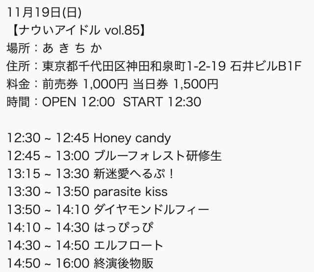 「ナウいアイドル vol.85」 日時:11/19(日) 開場18:30 / 開演19:00 会場:あ き ち か 料金:前売1,000円 / 当日1,500円 (1D別) 出演:エルフロート/ダイヤモンドルフィー/ブルーフォレスト研修生/はっぴっぴ/新迷愛へるぷ!/Honey candy 予約特典:天国地獄2S写メ