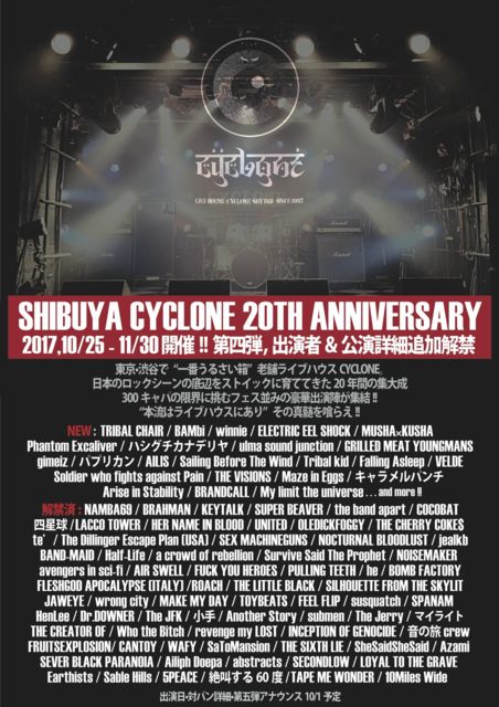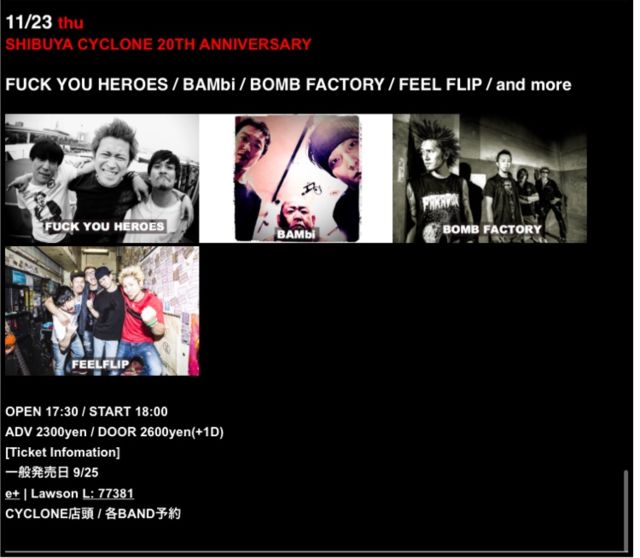 【サイクロン20周年、第四弾!!】 追加出演者発表、TRIBAL CHAIR / BAMbi等が復活!! OLEDICKFOGGY/ te’/ チェリコ/ NOISEMAKER/ SSTP/ FYH等、 公演日詳細追加解禁!! http://www.cyclone1997.com/20th/index.html 11/23 thu SHIBUYA CYCLONE 20TH ANNIVERSARY FUCK YOU HEROES / BAMbi / BOMB FACTORY / FEEL FLIP / and more OPEN 17:30 / START 18:00 ADV 2300yen / DOOR 2600yen(+1D) [Ticket Infomation] 一般発売日 9/25 e+ | Lawson L: 77381 CYCLONE店頭 / 各BAND予約