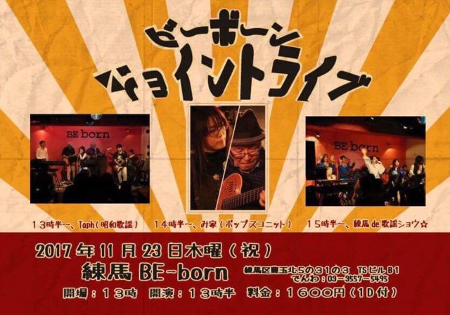 練馬music & live bar BEborn 本日、11月23日(木曜祝日)は、 【練馬de歌謡ショー主催ジョイントライブ】 open 13:00 start 13:30 charge 1600円 (1ドリンク付) ★13:30-14:15 Taph ★14:30-15:15 み家 ★15:30-16:15 練馬de昭和歌謡ショー ★17:00-19:00 打ち上げパーティー 明日、11月24日(金曜日)は、 【フリーセッション】 ★お気楽ライブ(ノルマ無し)出演者募集中! お気楽ライブ詳細 お気楽ライブとは、出演者の皆様どうしが、お互いのお客様となり プロ、アマを問わず楽しくライブをしましょうという企画です。 出演